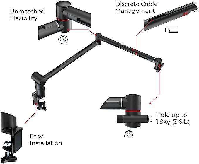 The Live Streamer Arm comes with discrete cable management to keep your workspace tidy and free of tangled cords, ensuring a professional look for your podcast, recording, or streaming setup.
