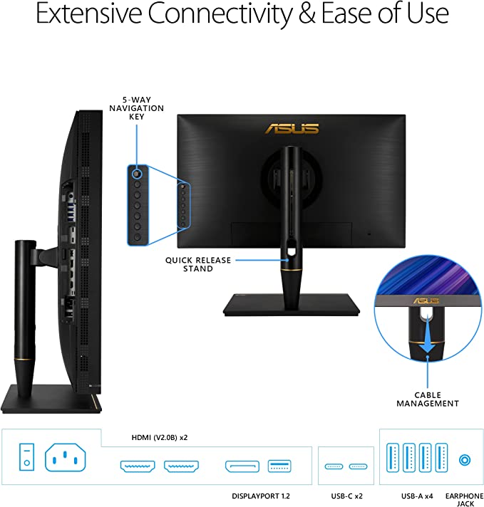 - World-leading delta-E (∆E) <1 color difference value for the sRGB and Adobe RGB color spaces and ASUS ProArt Hardware Calibration technology for color-accuracy optimization, uniformity and color profile write-back