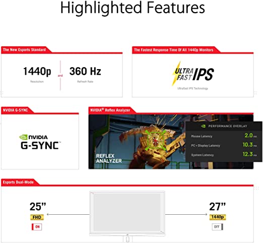 - Esports dual-mode enables the monitor to resize visuals to the familiar 25-inch diagonal at 1080p or 2368 x 1332